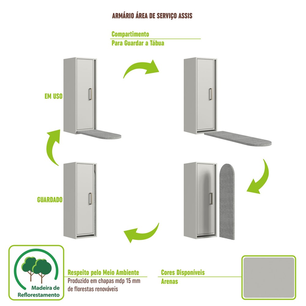 O(a) Armário Aéreo Lavanderia Assis 1 Porta com Tábua de Passar Arenas - Art In Móveis é produzido em MDP na escala de brilho Fosco, e possui um grau de dificuldade de montagem: Médio.