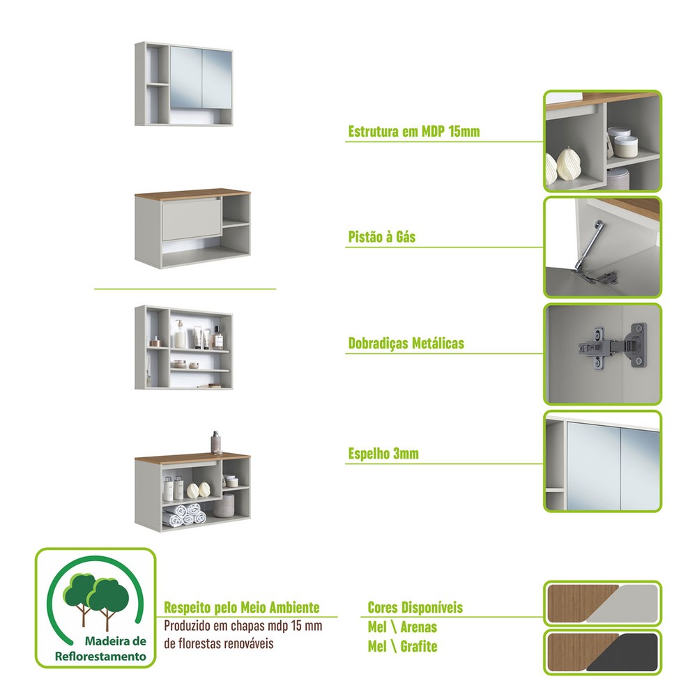 O(a) Armário de Banheiro Bacelona 3 Portas com Espelho Grafite - Art In Móveis é produzido em MDP na escala de brilho Fosco, e possui um grau de dificuldade de montagem: Médio.