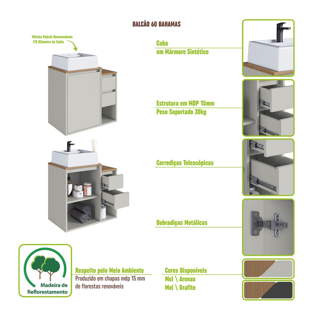 O(a) Armário de Banheiro Bahamas 1 Porta 2 Gavetas com Cuba Arenas - Art In Móveis é produzido em MDP na escala de brilho Fosco, e possui um grau de dificuldade de montagem: Médio.