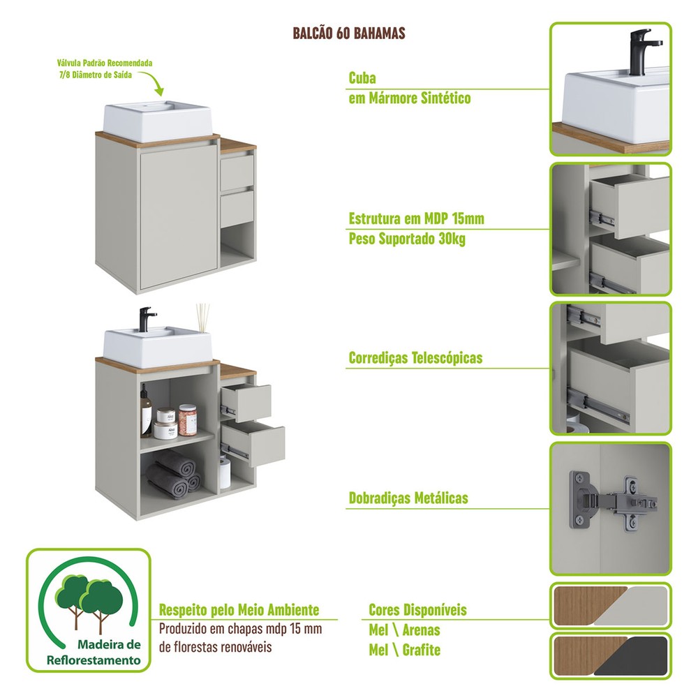 O(a) Armário de Banheiro Bahamas 1 Porta 2 Gavetas com Cuba Grafite - Art In Móveis é produzido em MDP na escala de brilho Fosco, e possui um grau de dificuldade de montagem: Médio.