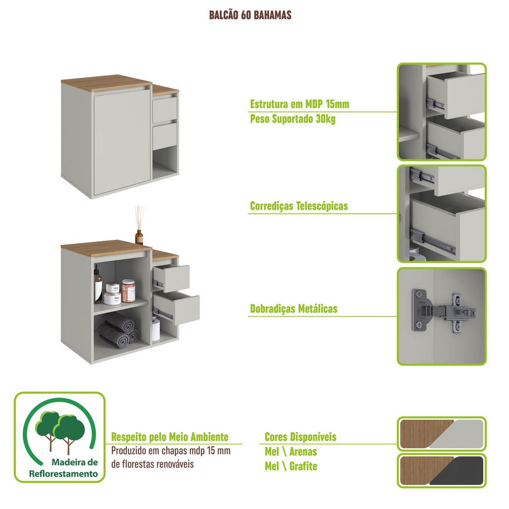 O(a) Armário de Banheiro Bahamas 1 Porta 2 Gavetas Grafite - Art In Móveis é produzido em MDP na escala de brilho Fosco, e possui um grau de dificuldade de montagem: Médio.