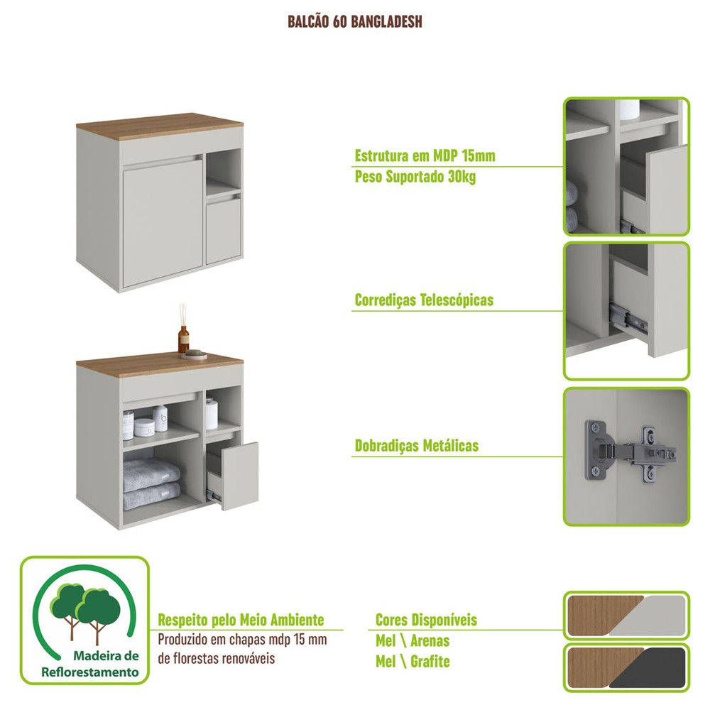 O(a) Armário de Banheiro Bangladesh 1 Porta 1 Gaveta Arenas - Art In Móveis é produzido em MDP na escala de brilho Fosco, e possui um grau de dificuldade de montagem: Médio.