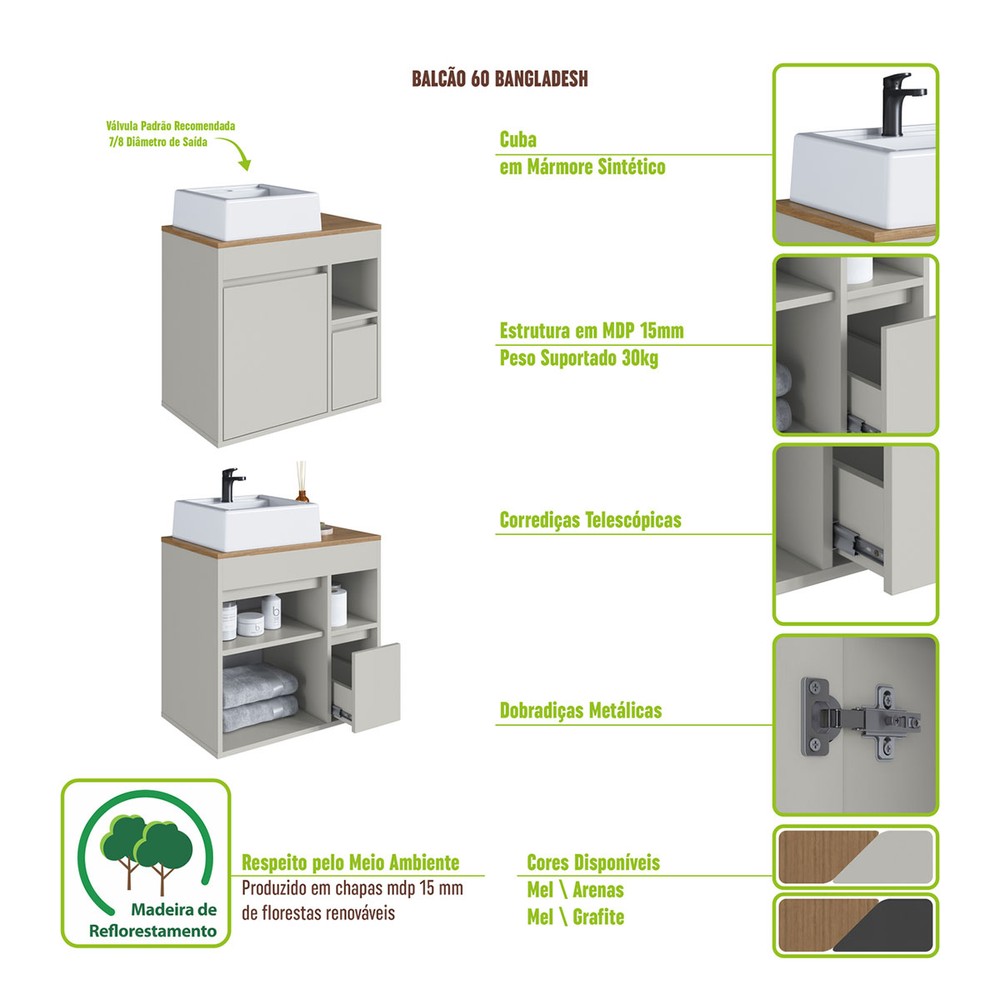 O(a) Armário de Banheiro Bangladesh 1 Porta 1 Gaveta com Cuba Grafite - Art In Móveis é produzido em MDP na escala de brilho Fosco, e possui um grau de dificuldade de montagem: Médio.