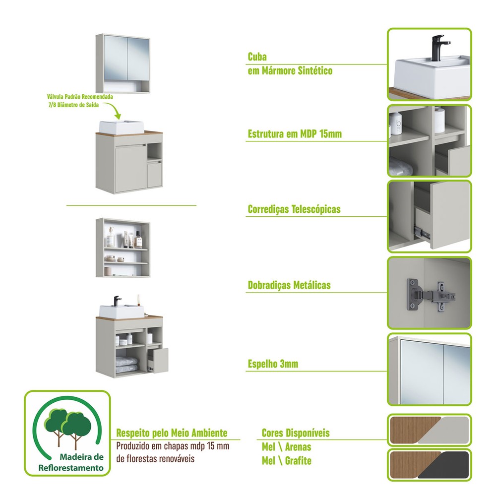 Armário de Banheiro Bangladesh 3 Portas 1 Gaveta com Cuba e com Espelho Arenas - Art In Móveis