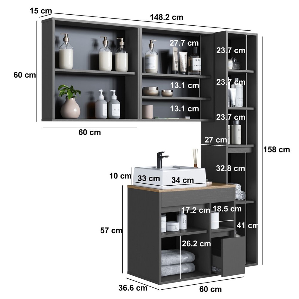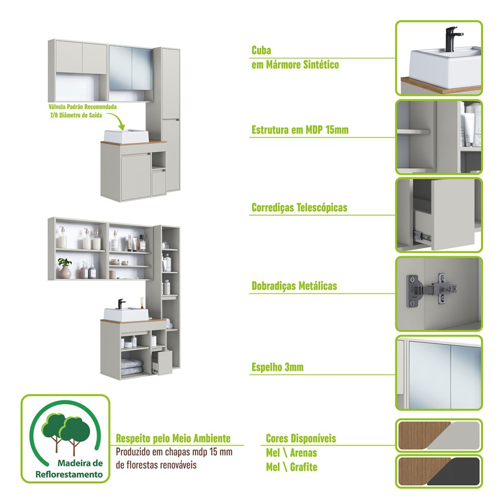 O(a) Armário de Banheiro Bangladesh 7 Portas 1 Gaveta com Cuba e Espelho Grafite - Art In Móveis é produzido em MDP na escala de brilho Fosco, e possui um grau de dificuldade de montagem: Médio.