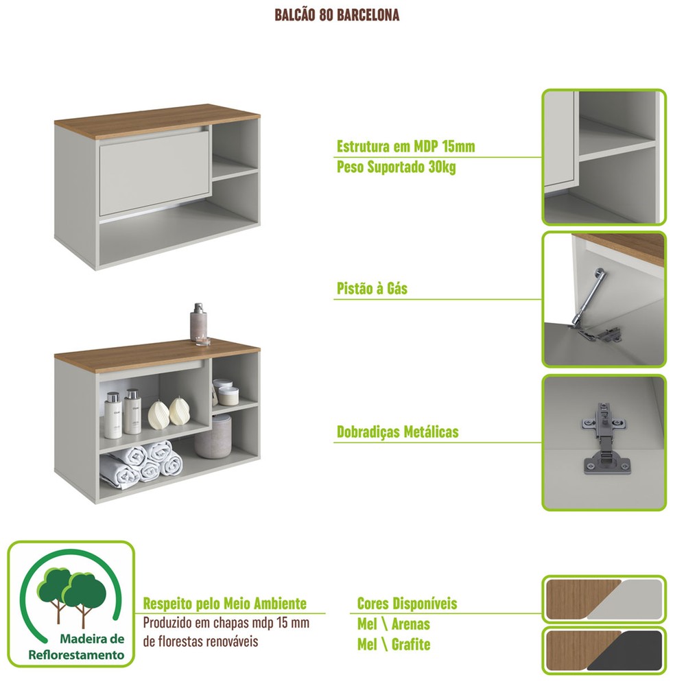 O(a) Armário de Banheiro Barcelona 1 Porta Arenas - Art In Móveis é produzido em MDP na escala de brilho Fosco, e possui um grau de dificuldade de montagem: Médio.
