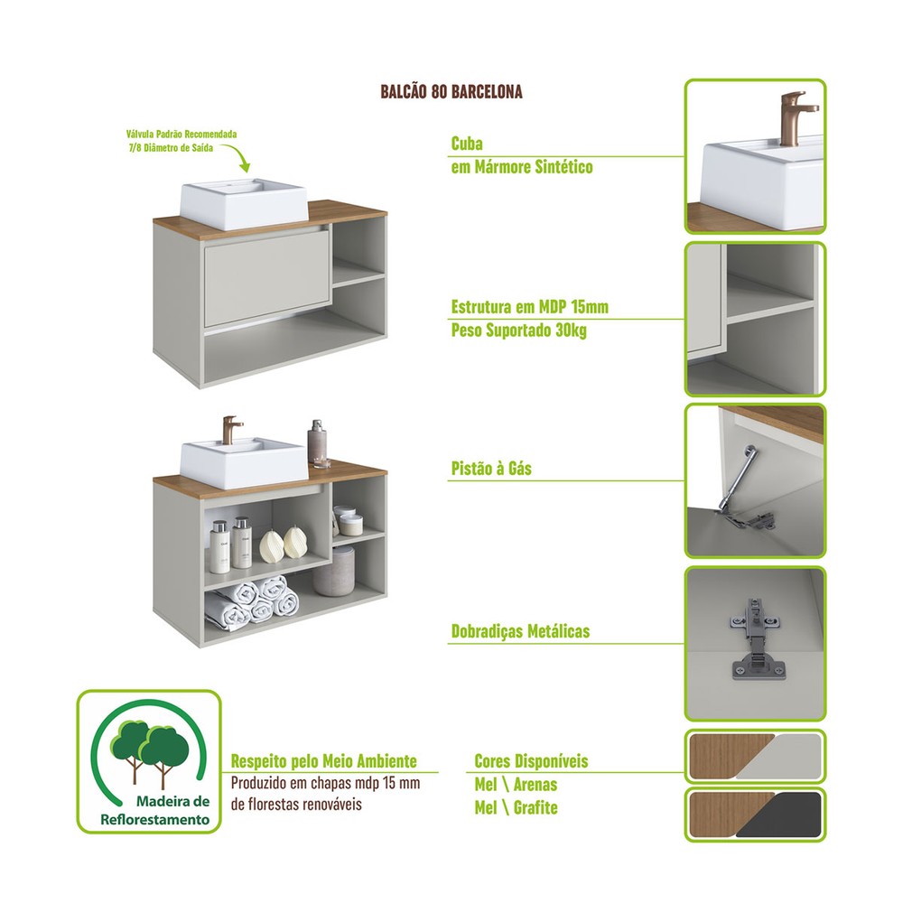 O(a) Armário de Banheiro Barcelona 1 Porta com Cuba Grafite - Art In Móveis é produzido em MDP na escala de brilho Fosco, e possui um grau de dificuldade de montagem: Médio.