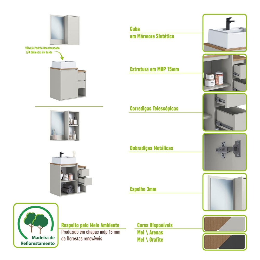 O(a) Armário de Banheiro Bari 2 Portas 2 Gavetas com Cuba e Espelho Arenas - Art In Móveis é produzido em MDP na escala de brilho Fosco, e possui um grau de dificuldade de montagem: Médio.