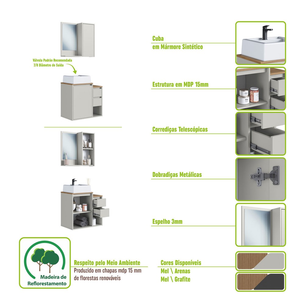 O(a) Armário de Banheiro Bari 2 Portas 2 Gavetas com Cuba e Espelho Grafite - Art In Móveis é produzido em MDP na escala de brilho Fosco, e possui um grau de dificuldade de montagem: Médio.
