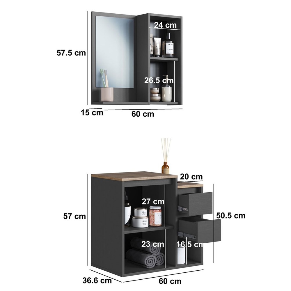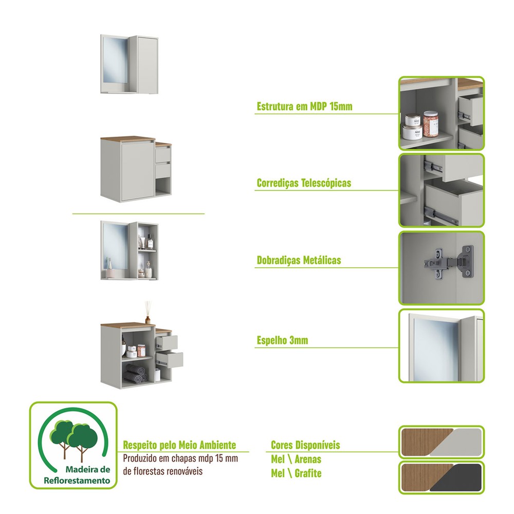 O(a) Armário de Banheiro Bari 2 Portas 2 Gavetas com Espelho Grafite - Art In Móveis é produzido em MDP na escala de brilho Fosco, e possui um grau de dificuldade de montagem: Médio.