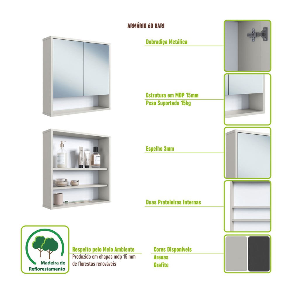 O(a) Armário de Banheiro Bari 2 Portas 60 Cm com Espelho Grafite - Art In Móveis é produzido em MDP na escala de brilho Fosco, e possui um grau de dificuldade de montagem: Médio.
