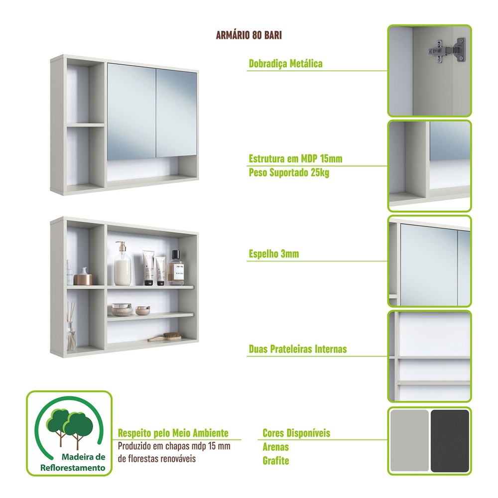 O(a) Armário de Banheiro Bari 2 Portas com Espelho Grafite - Art In Móveis é produzido em MDP na escala de brilho Fosco, e possui um grau de dificuldade de montagem: Médio.