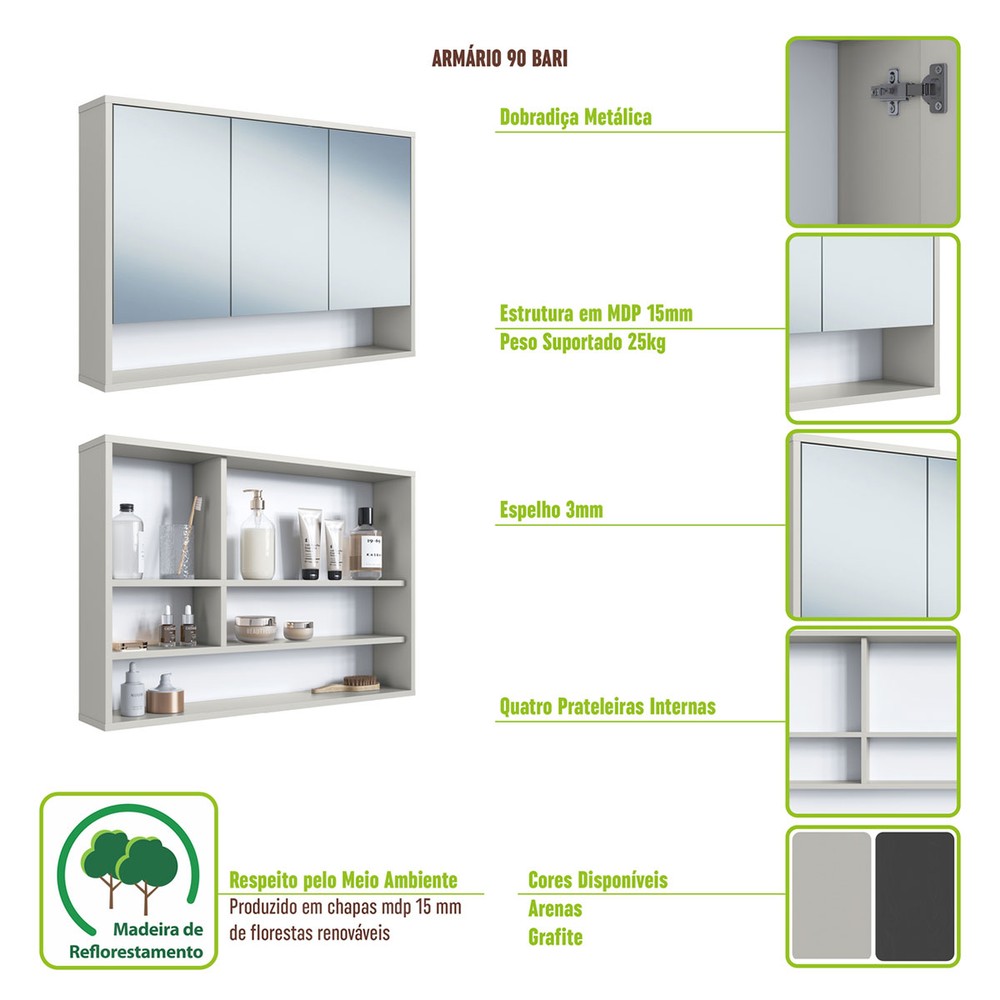 Armário de Banheiro Bari 3 Portas com Espelho Arenas - Art In Móveis