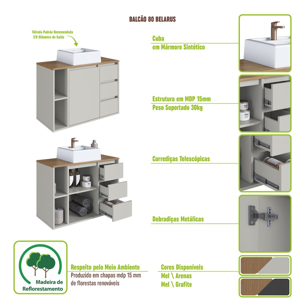 O(a) Armário de Banheiro Belagavi 1 Porta 3 Gavetas com Cuba Grafite - Art In Móveis é produzido em MDP na escala de brilho Fosco, e possui um grau de dificuldade de montagem: Médio.