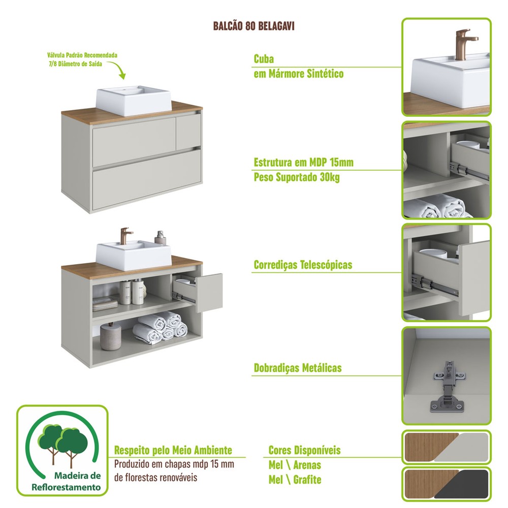O(a) Armário de Banheiro Belarus 2 Portas 1 Gaveta com Cuba Grafite - Art In Móveis é produzido em MDP na escala de brilho Fosco, e possui um grau de dificuldade de montagem: Médio.