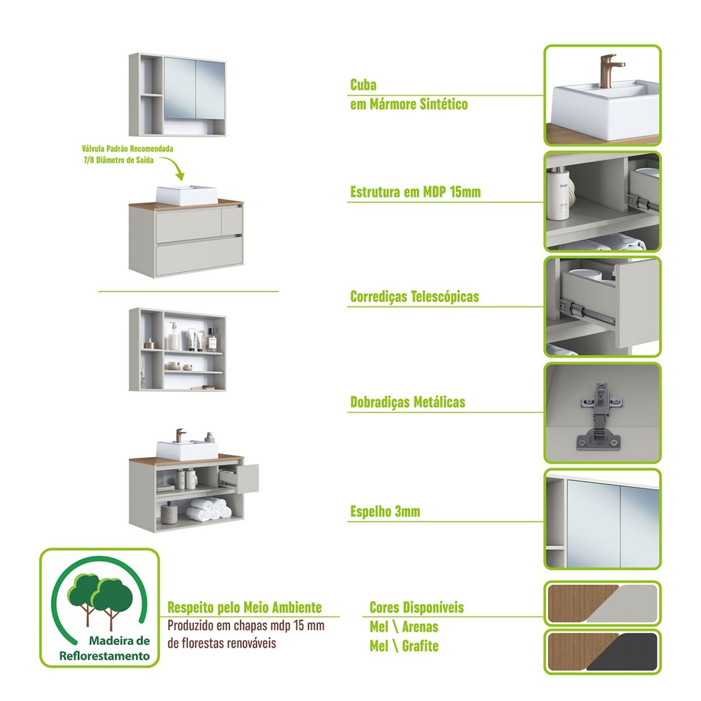 O(a) Armário de Banheiro Belarus 4 Portas 1 Gaveta com Cuba e Espelho Arenas - Art In Móveis é produzido em MDP na escala de brilho Fosco, e possui um grau de dificuldade de montagem: Médio.