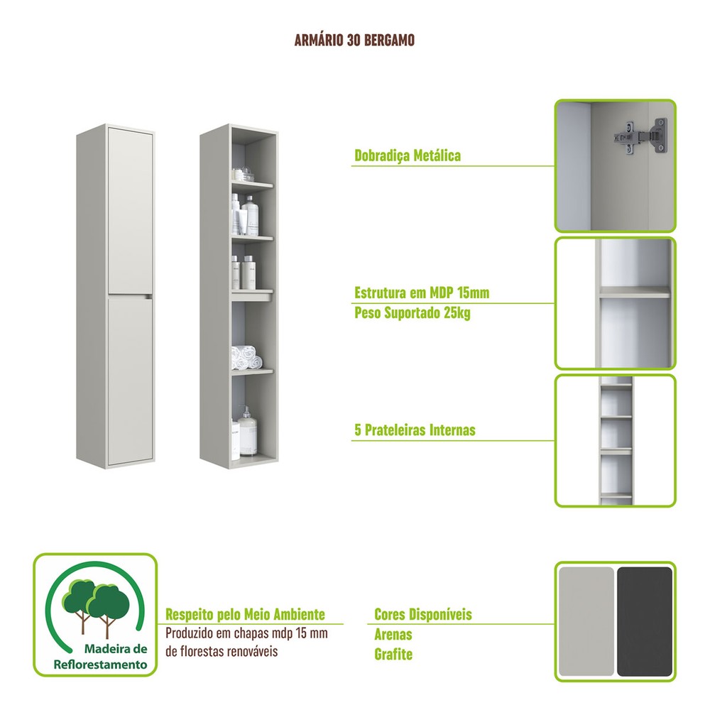 O(a) Armário de Banheiro Bergamo 2 Portas 4 Prateleiras Arenas - Art In Móveis é produzido em MDP na escala de brilho Fosco, e possui um grau de dificuldade de montagem: Médio.