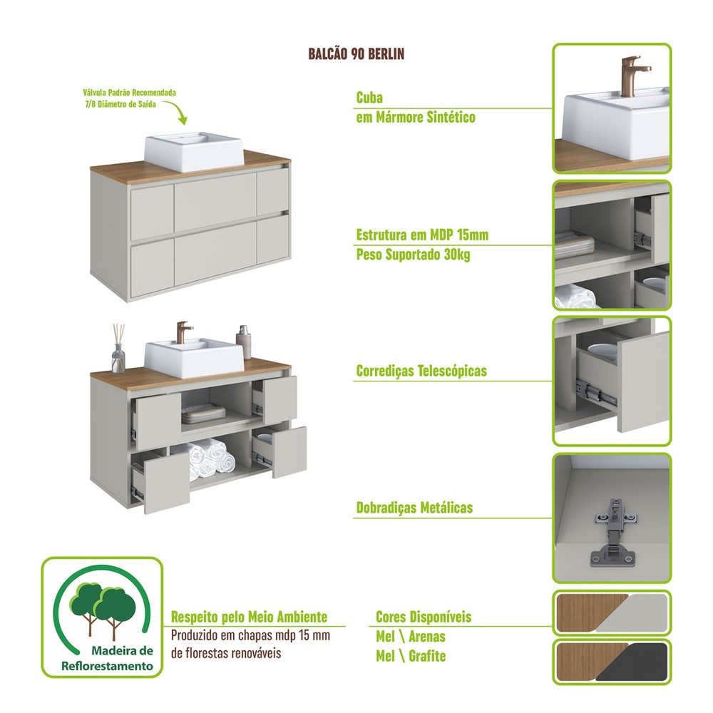 O(a) Armário de Banheiro Berlim 2 Portas 4 Gavetas com Cuba Arenas - Art In Móveis é produzido em MDP na escala de brilho Fosco, e possui um grau de dificuldade de montagem: Médio.
