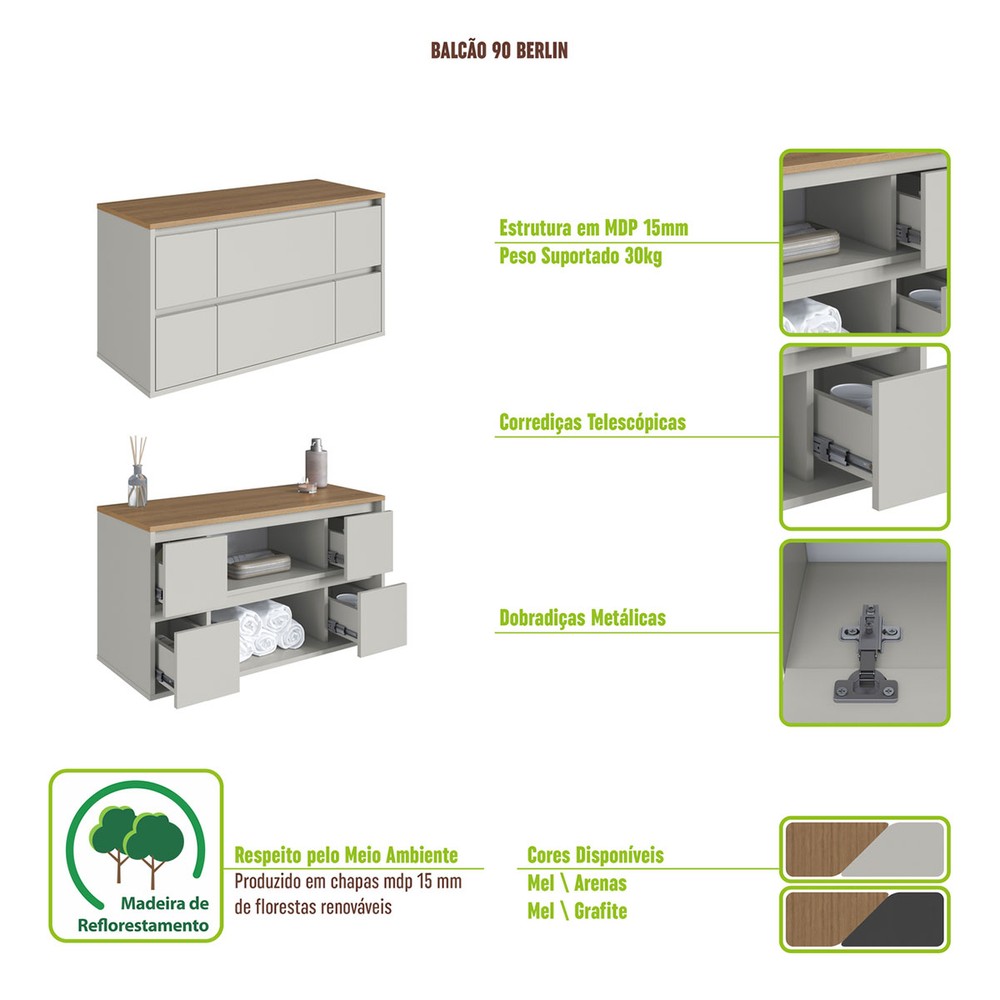 O(a) Armário de Banheiro Berlim 2 Portas 4 Gavetas Grafite - Art In Móveis é produzido em MDP na escala de brilho Fosco, e possui um grau de dificuldade de montagem: Médio.