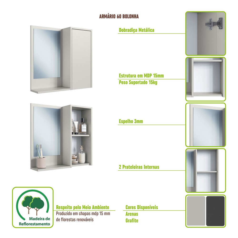 O(a) Armário de Banheiro Bologna 1 Porta com Espelho Grafite - Art In Móveis é produzido em MDP na escala de brilho Fosco, e possui um grau de dificuldade de montagem: Médio.