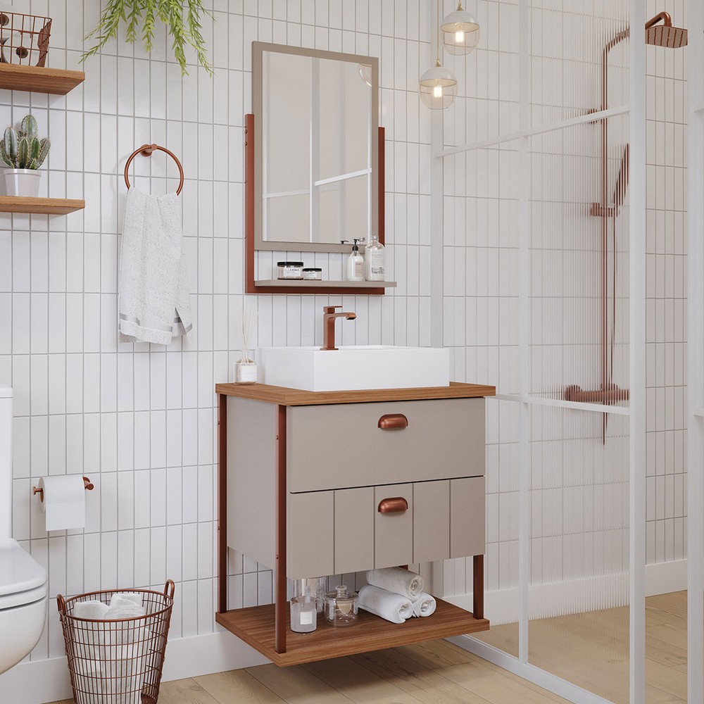 O(a) Armário de Banheiro Uni 60cm 2 Gavetas C/ Espelheira 100% Mdf Cappuccino/Freijó - Mgm Móveis é produzido em 100% MDF na escala de brilho Semi-Brilho, e possui um grau de dificuldade de montagem: Médio.