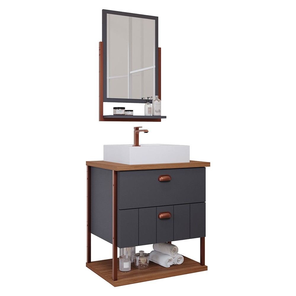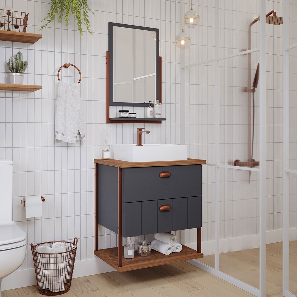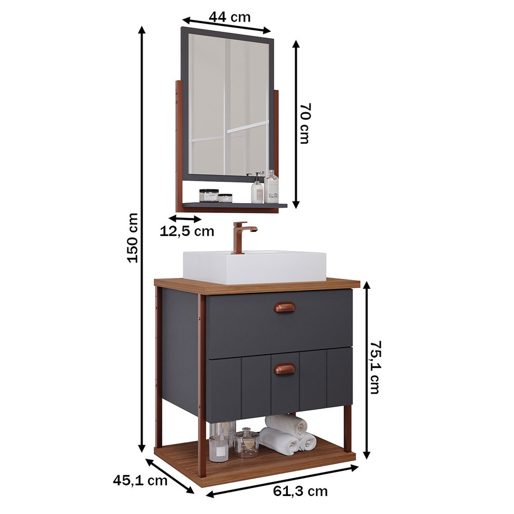 O(a) Armário de Banheiro Uni 60cm 2 Gavetas C/ Espelheira 100% Mdf Titanium/Freijó - Mgm Móveis é produzido em 100% MDF na escala de brilho Semi-Brilho, e possui um grau de dificuldade de montagem: Médio.