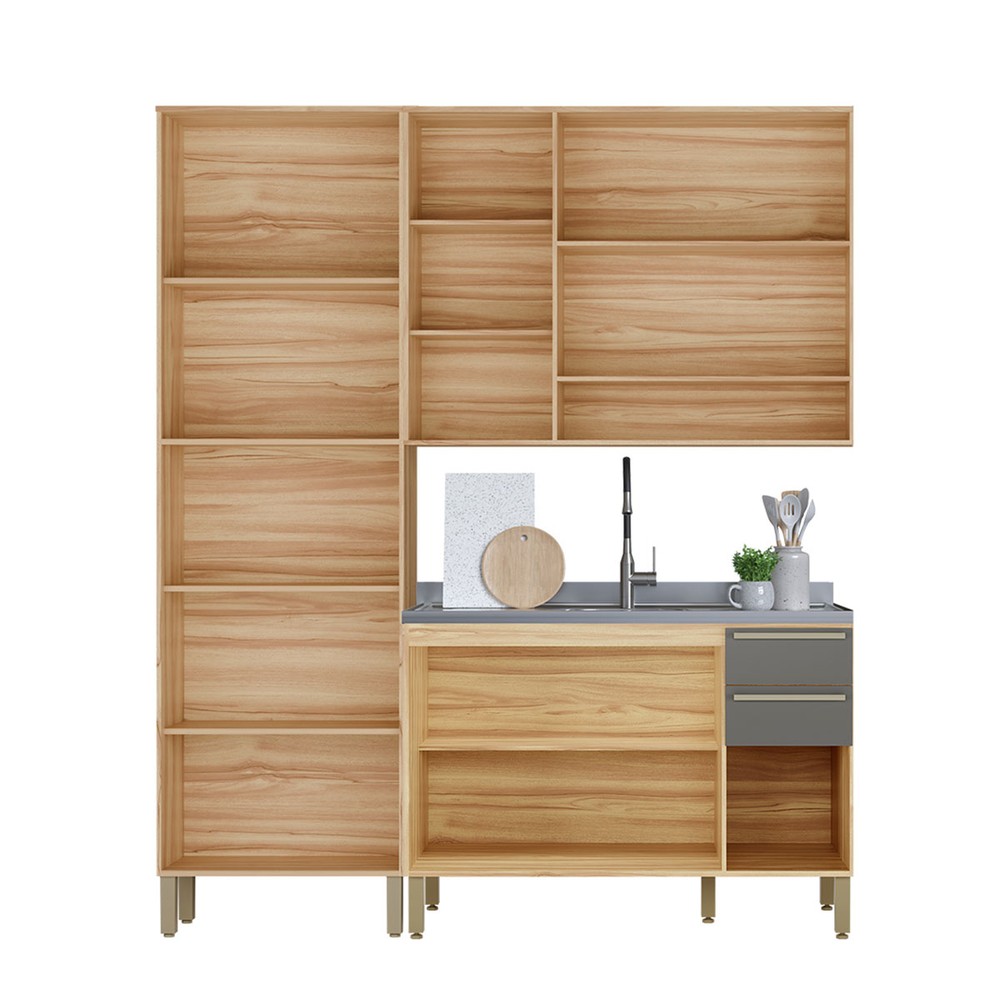 Armário de Cozinha com Balcão e Tampo 10 Portas 2 Gavetas Xangai 100% Mdf Vidro Reflecta Amêndoa/Chumbo - Pnr Móveis
