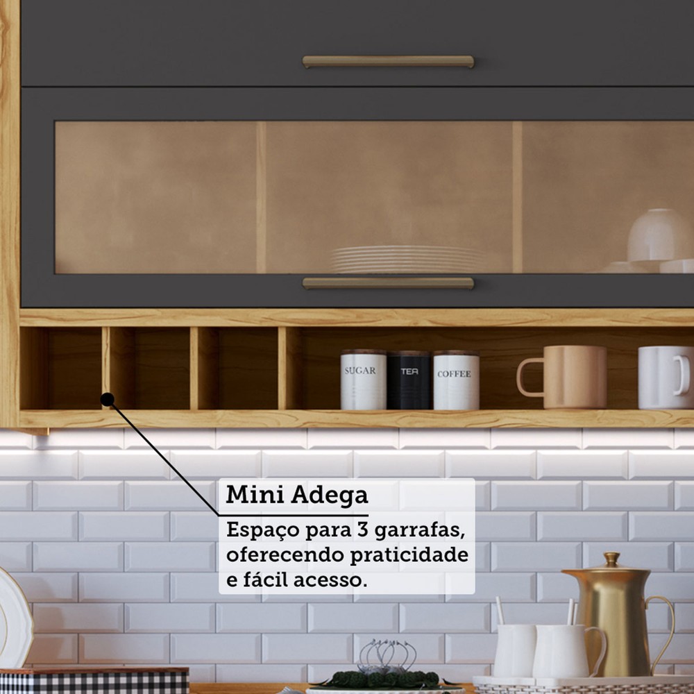 Armário de Cozinha com Balcão e Tampo 12 Portas 4 Gavetas Pérola 100% Mdf Vidro Reflecta Amêndoa/Chumbo - Pnr Móveis