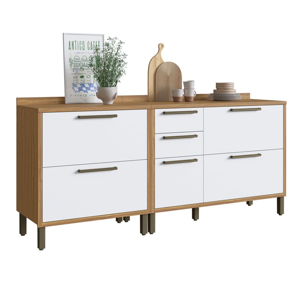 Armário de Cozinha com Balcão e Tampo 3 Portas 4 Gavetas Pérola 100% Mdf Vidro Reflecta Amêndoa/Branco - Pnr Móveis