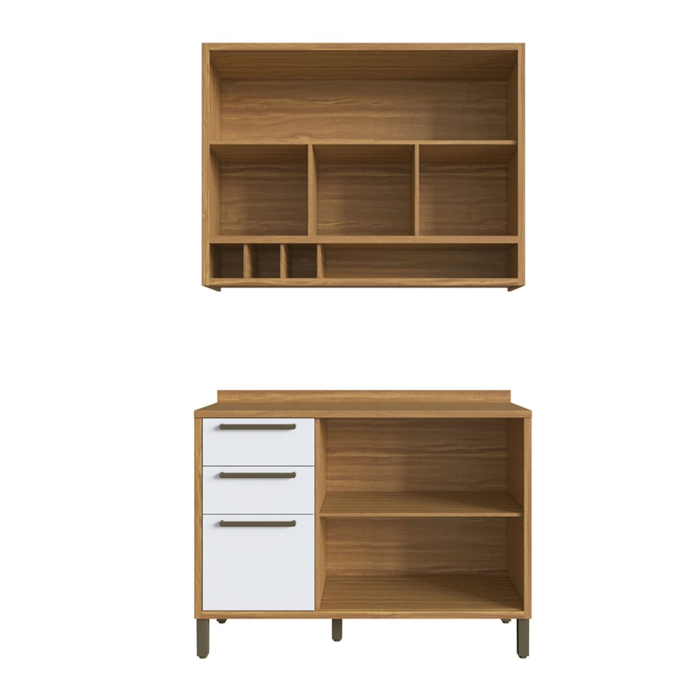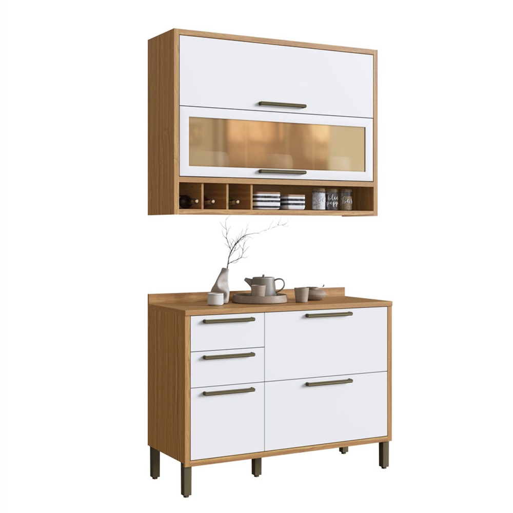 Armário de Cozinha com Balcão e Tampo 4 Portas 3 Gavetas Pérola 100% Mdf Vidro Reflecta Amêndoa/Branco - Pnr Móveis