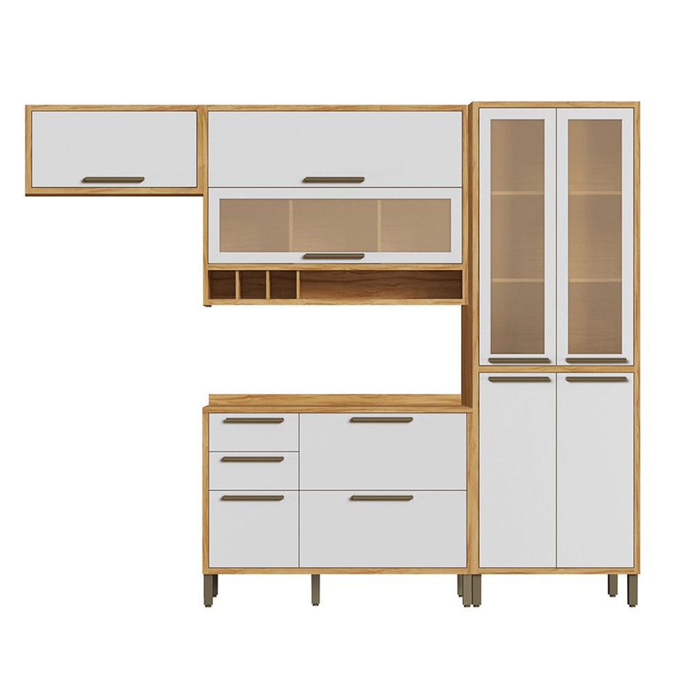 Armário de Cozinha com Balcão e Tampo 9 Portas 3 Gavetas Pérola 100% Mdf Vidro Reflecta Amêndoa/Branco - Pnr Móveis