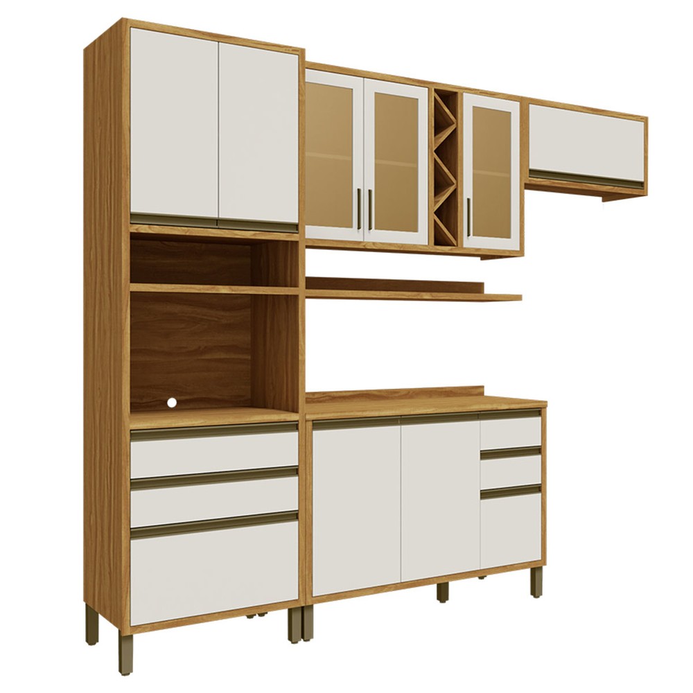 Armário de Cozinha com Balcão e Tampo 9 Portas 5 Gavetas Pérola 100% Mdf Vidro Reflecta Amêndoa/Off White - Pnr Móveis