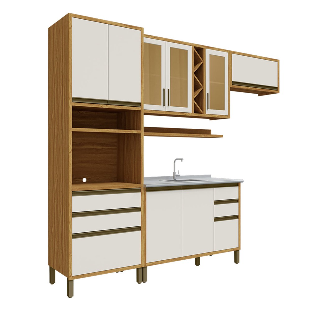 Armário de Cozinha com Balcão para Pia 9 Portas 5 Gavetas Pérola 100% Mdf Vidro Reflecta Amêndoa/Off White - Pnr Móveis