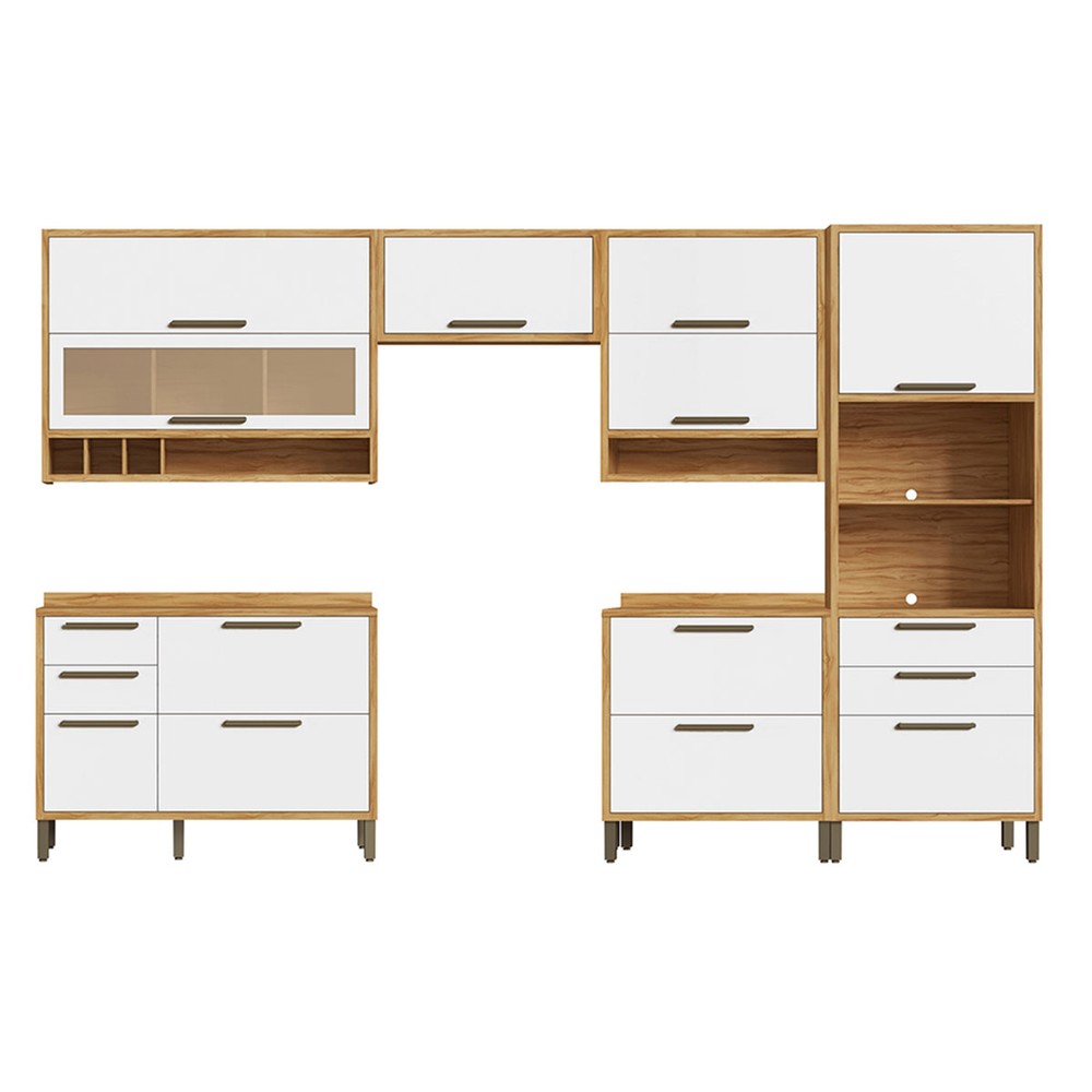 Armário de Cozinha Modulada com Balcão e Tampo 10 Portas 6 Gavetas ágata 100% Mdf Vidro Reflecta Amêndoa/Branco - Pnr Móveis