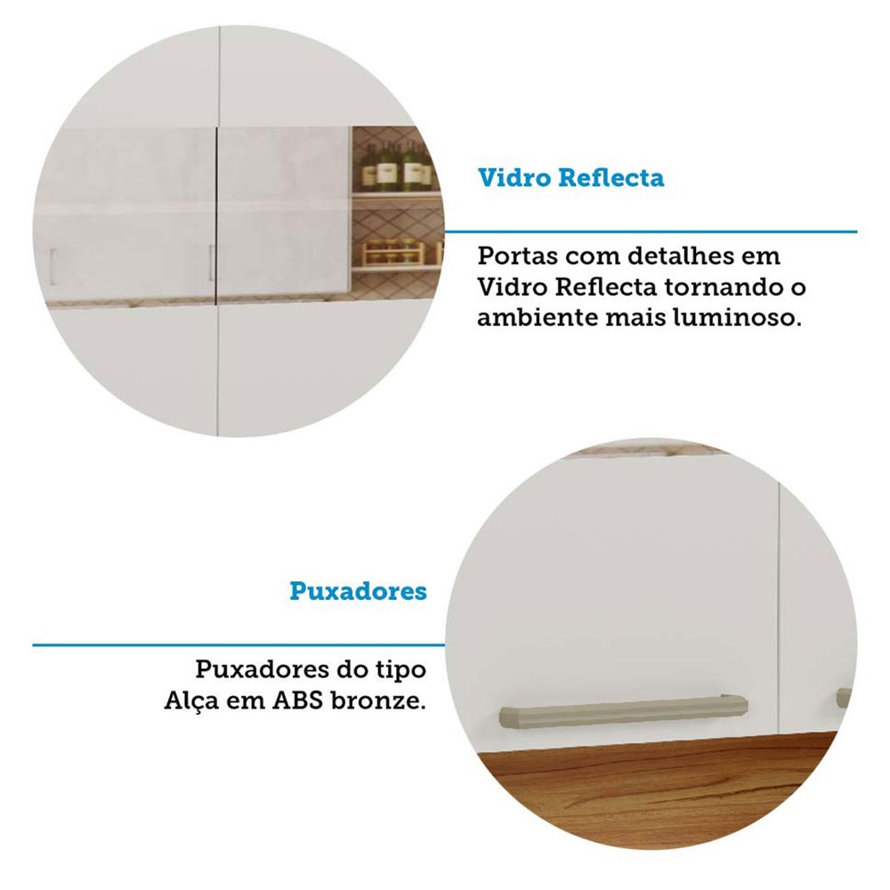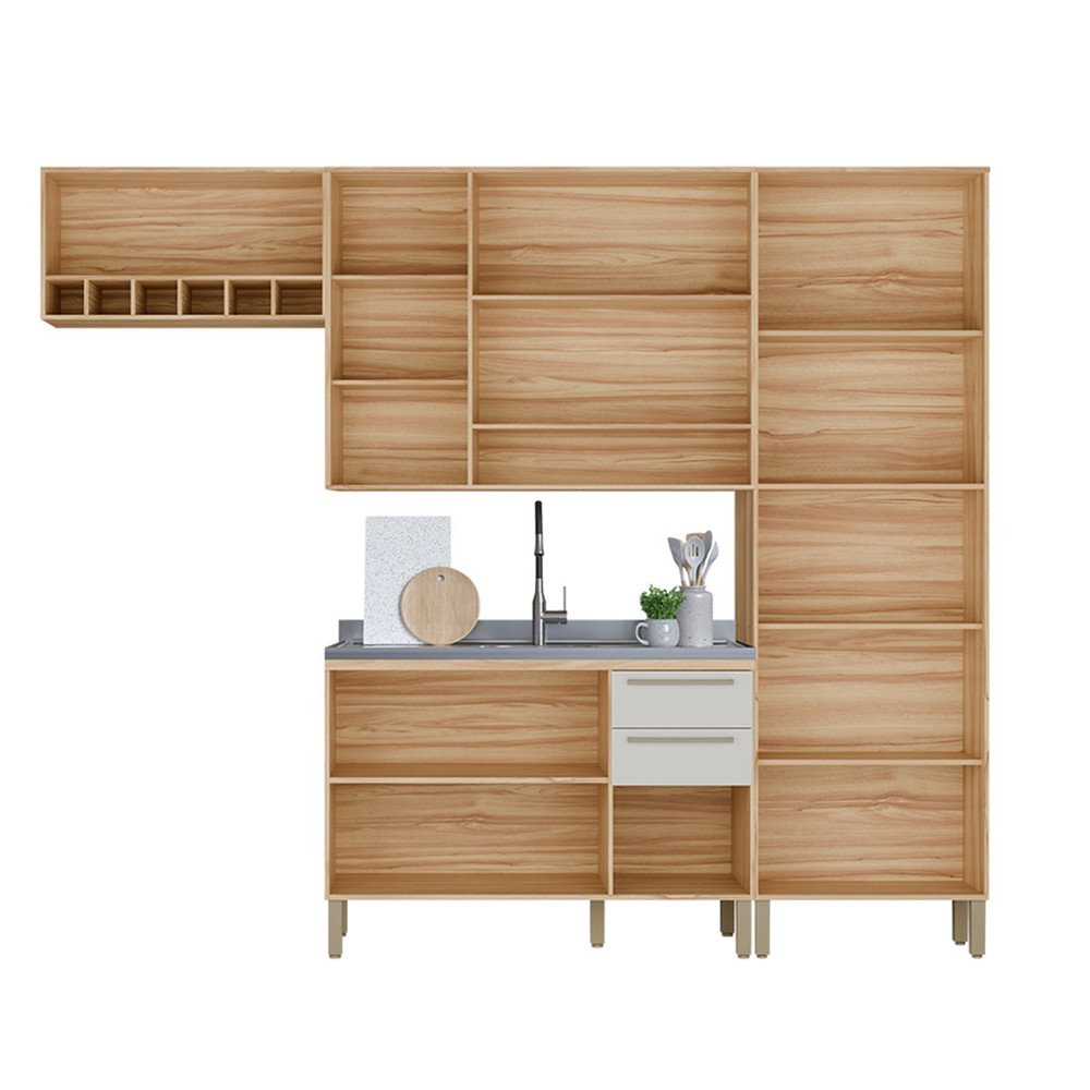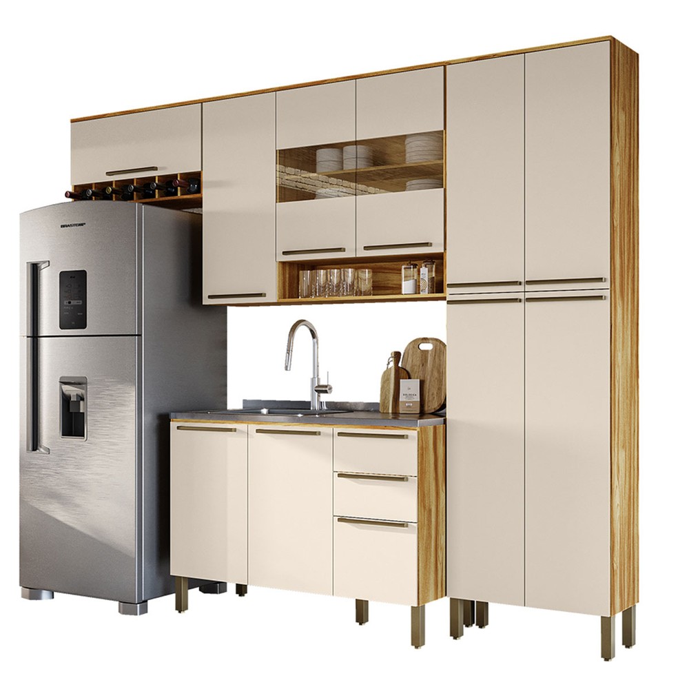 Armário de Cozinha Modulada com Balcão e Tampo 11 Portas 2 Gavetas Xangai 100% Mdf com Vidro Reflecta Amêndoa/Off White - Pnr Móveis