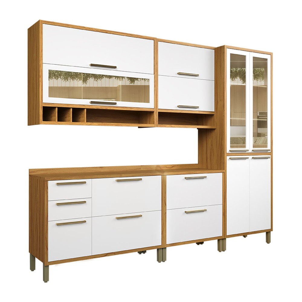 Armário de Cozinha Modulada com Balcão e Tampo 11 Portas 4 Gavetas ágata 100% Mdf Vidro Reflecta Amêndoa/Branco - Pnr Móveis