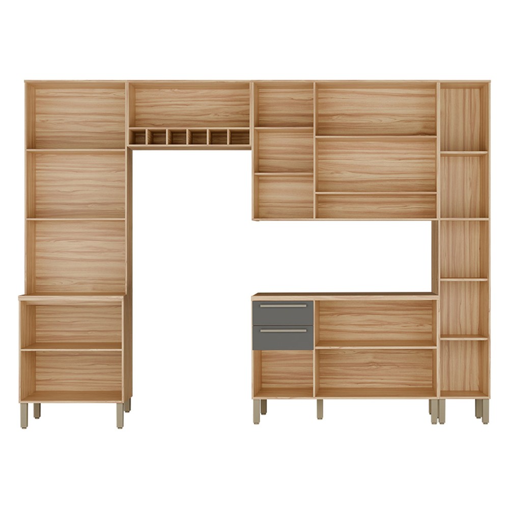 Armário de Cozinha Modulada com Balcão e Tampo 13 Portas 2 Gavetas Xangai 100% Mdf com Vidro Reflecta Amêndoa/Chumbo - Pnr Móveis