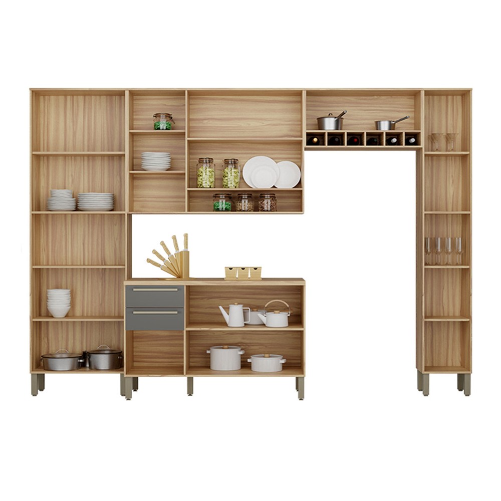 Armário de Cozinha Modulada com Balcão e Tampo 13 Portas 2 Gavetas Xangai Slim 100% Mdf com Vidro Reflecta Amêndoa/Chumbo - Pnr Móveis