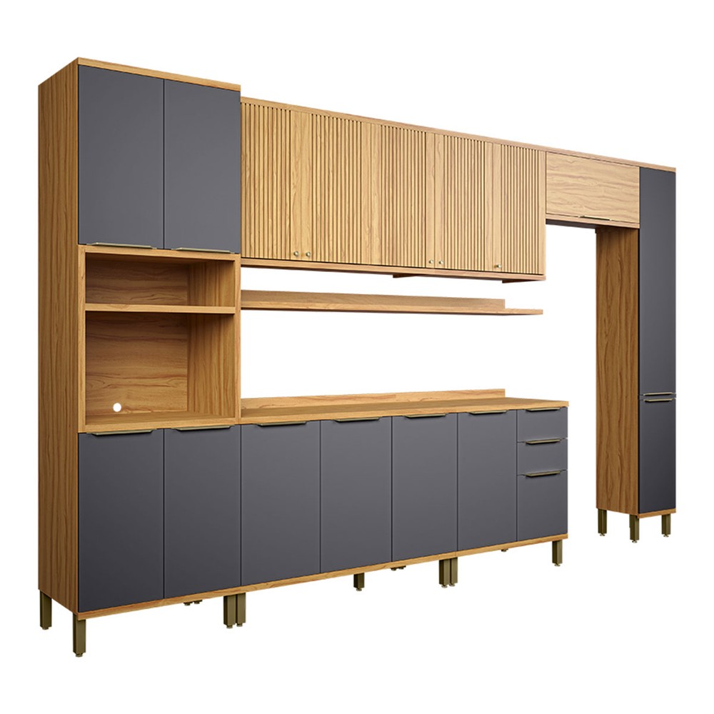 O(a) Armário de Cozinha Modulada com Balcão e Tampo 16 Portas 3 Gavetas Nice Fresado 100% Mdf Amêndoa/Chumbo - Pnr Móveis é produzido em 100% MDF na escala de brilho Semi-Brilho, e possui um grau de dificuldade de montagem: Médio.