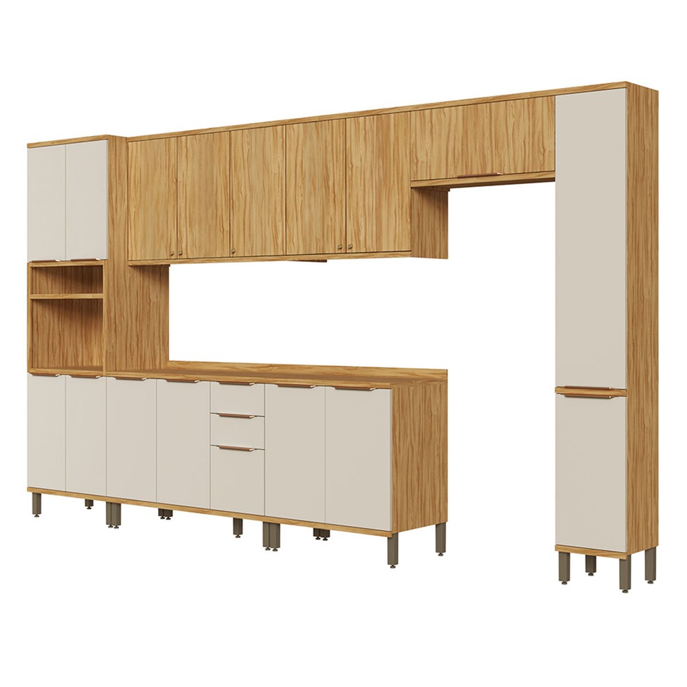 Armário de Cozinha Modulada com Balcão e Tampo 16 Portas 3 Gavetas Nice Plus 100% Mdf Amêndoa/Off White - Pnr Móveis