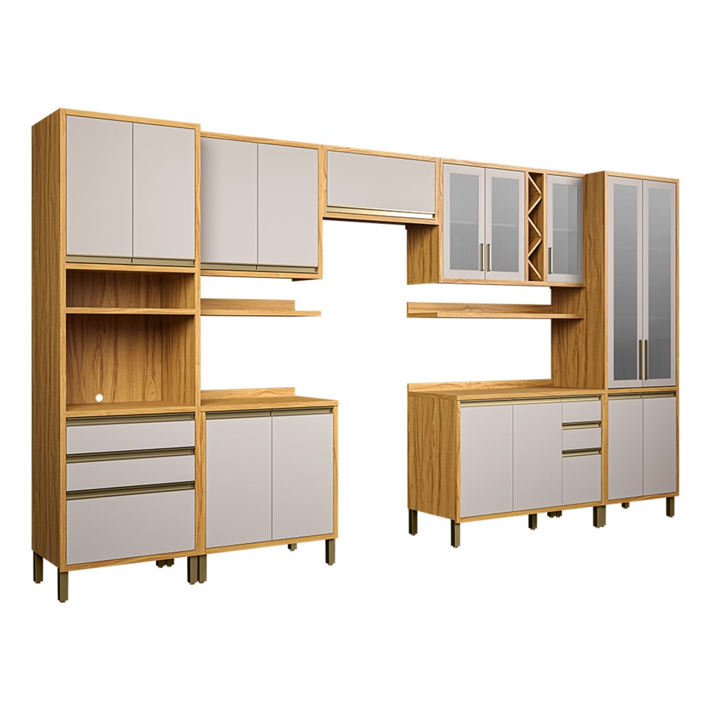 O(a) Armário de Cozinha Modulada com Balcão e Tampo 17 Portas 5 Gavetas Pérola Premium 100% Mdf Vidro Reflecta Amêndoa/Off White - Pnr Móveis é produzido em 100% MDF na escala de brilho Semi-Brilho, e possui um grau de dificuldade de montagem: Médio.