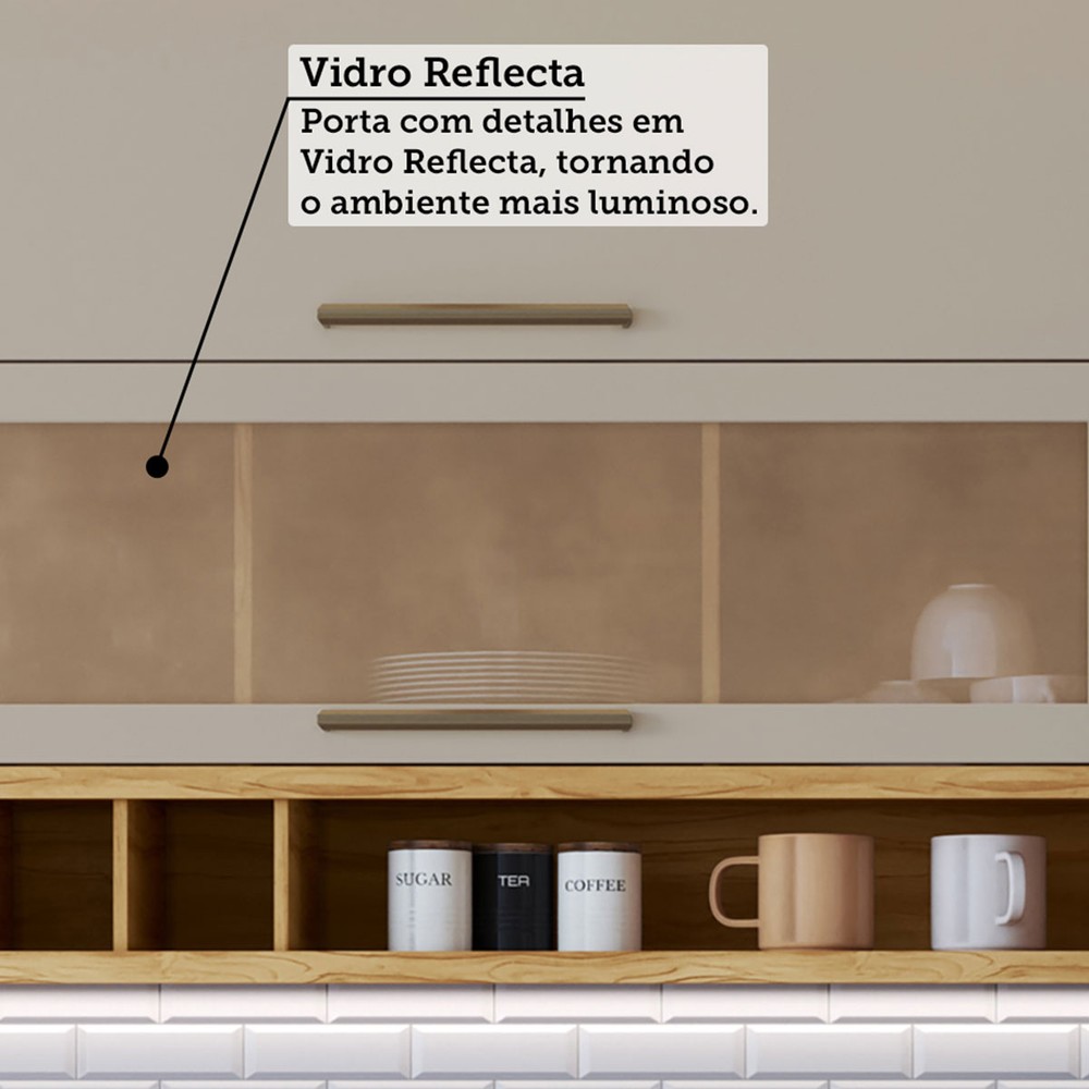 Armário de Cozinha Modulada com Balcão e Tampo 7 Portas 5 Gavetas ágata 100% Mdf Vidro Reflecta Amêndoa/Off White - Pnr Móveis