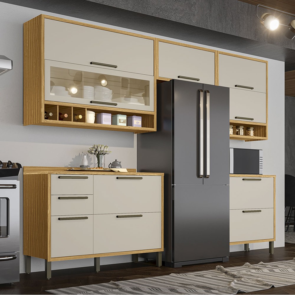 Armário de Cozinha Modulada com Balcão e Tampo 8 Portas 4 Gavetas ágata 100% Mdf Vidro Reflecta Amêndoa/Off White - Pnr Móveis