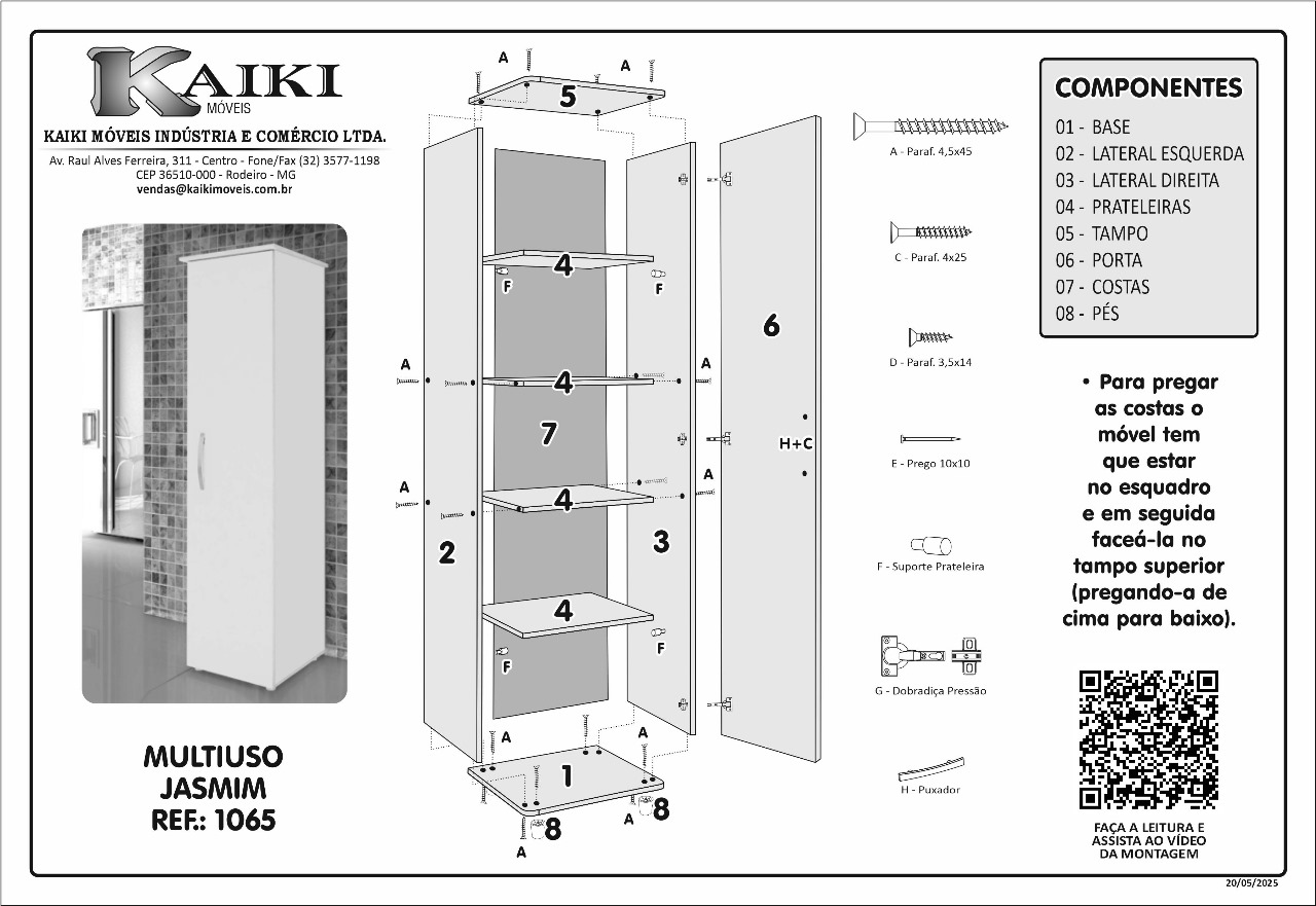 O(a) Armário Multiuso Jasmim 1 Porta Branco - Kaiki Móveis é produzido em MDP na escala de brilho Fosco, e possui um grau de dificuldade de montagem: Médio.