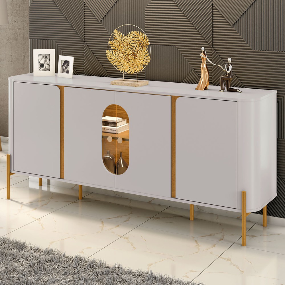 O(a) Balcão Buffet Tambaú 4 Portas 1 Prateleira com Vidro e Led Off-White/Naturalle - Móveis Bechara é produzido em MDP na escala de brilho Brilho e Fosco, e possui um grau de dificuldade de montagem: Médio.