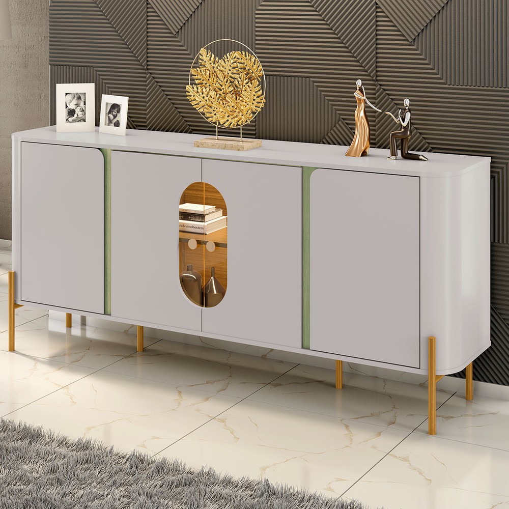 O(a) Balcão Buffet Tambaú 4 Portas 1 Prateleira com Vidro e Led Off-White/Pistache - Móveis Bechara é produzido em MDP na escala de brilho Brilho e Fosco, e possui um grau de dificuldade de montagem: Médio.