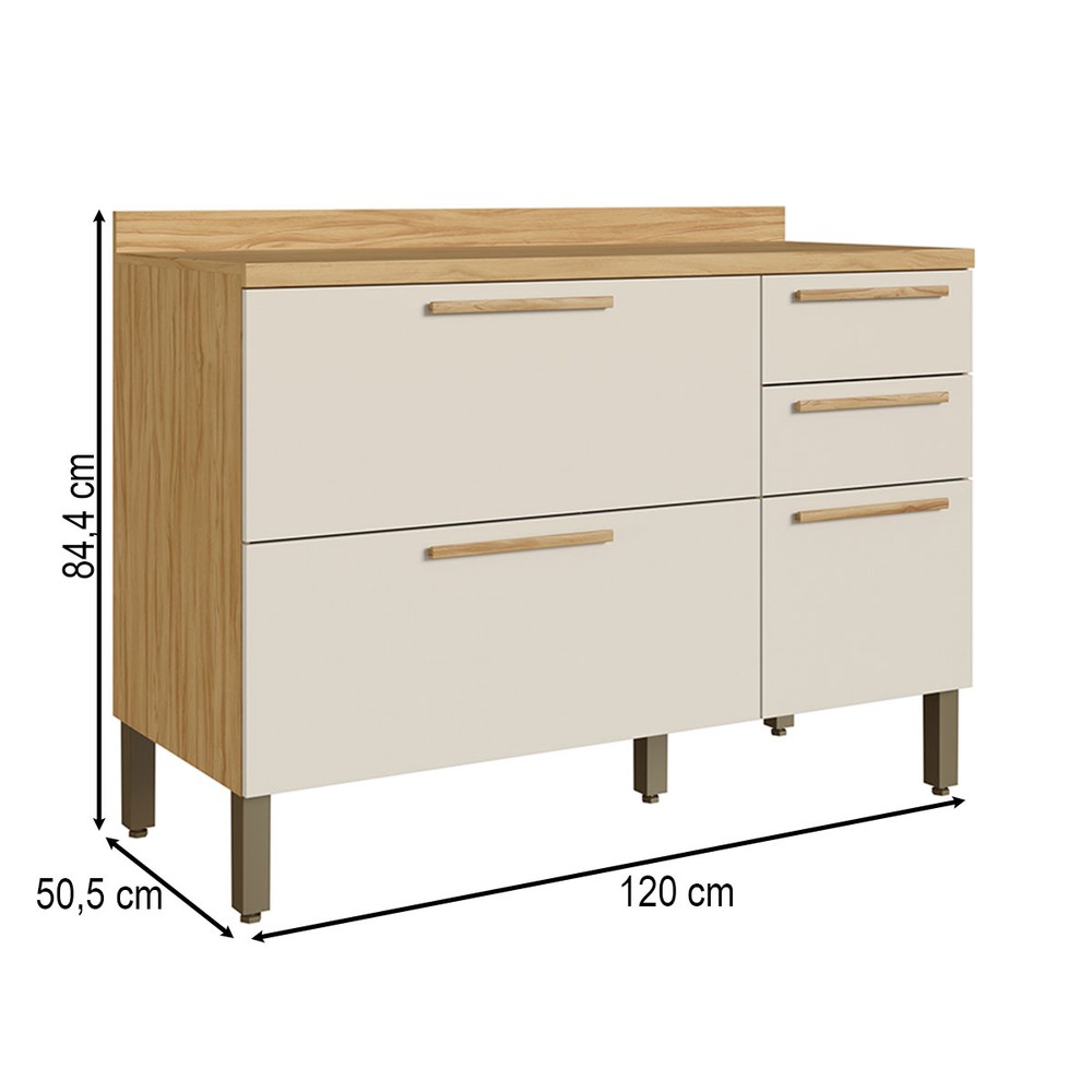 Balcão de Cozinha 120 Cm Riesling 3 Portas 2 Gavetas 100% Mdf Amêndoa/Off White - Rio Doce