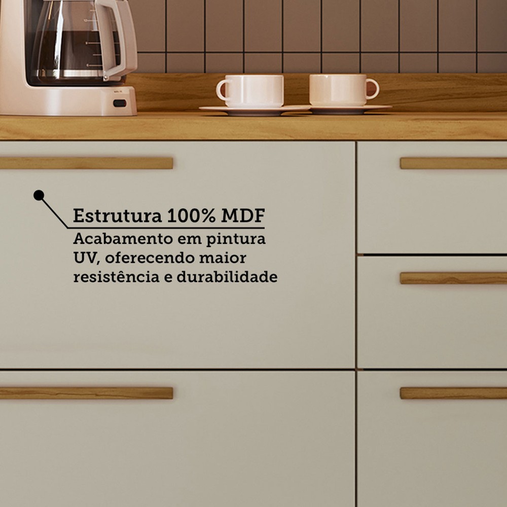 O(a) Balcão de Cozinha 120 Cm Riesling 3 Portas 2 Gavetas 100% Mdf Amêndoa/Off White - Rio Doce é produzido em 100% MDF na escala de brilho Semi-Brilho, e possui um grau de dificuldade de montagem: Médio.