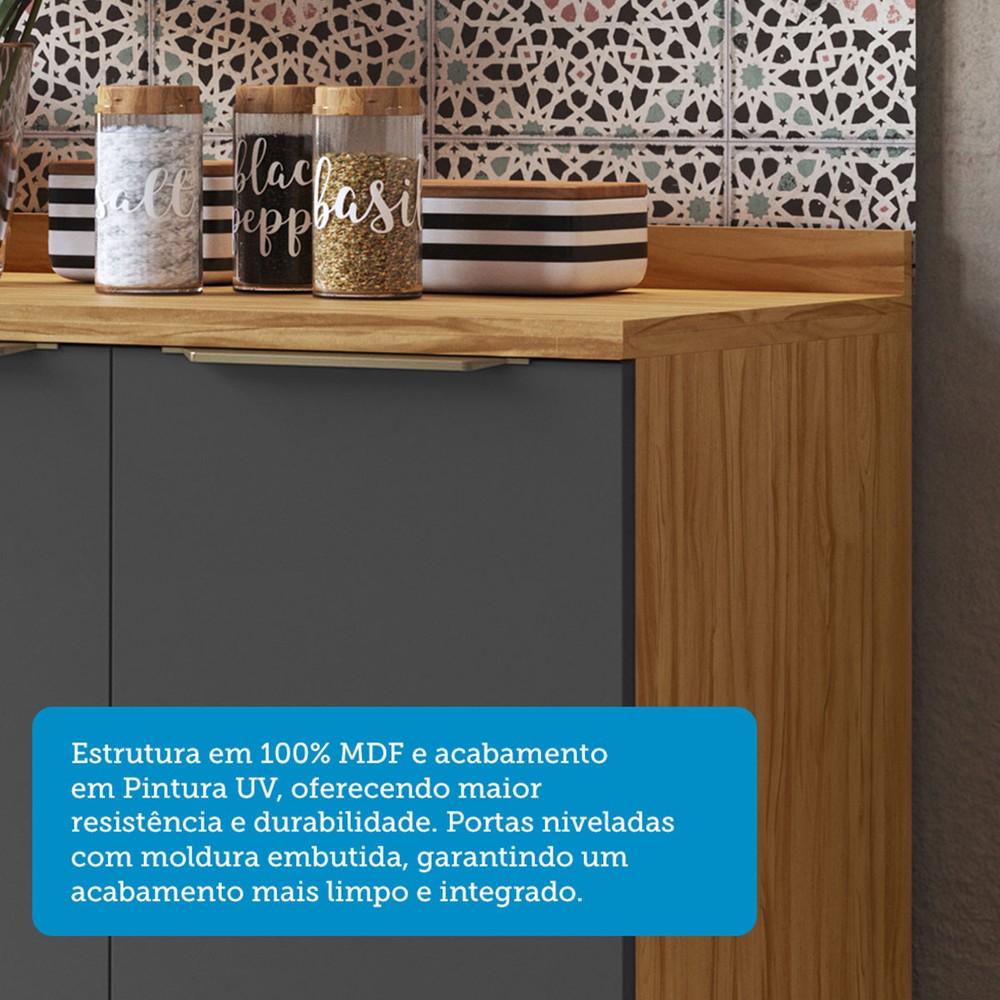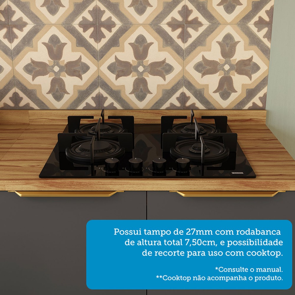 Observação - Objetos decorativos que aparecem nas imagens, não acompanham o produto. - Portas e gavetas niveladas com moldura embutida. - Laterais 12mm. Fundo em HDF 2,5mm. - Pés com 17cm de altura. - Altura total com rodabanca: 94,80cm. - Medida do tampo: 80 x 49 x 2,7 (L x P x A - cm). - Possui marcação para auxiliar no corte para encaixe do cooktop. Cooktop não acompanha o produto.