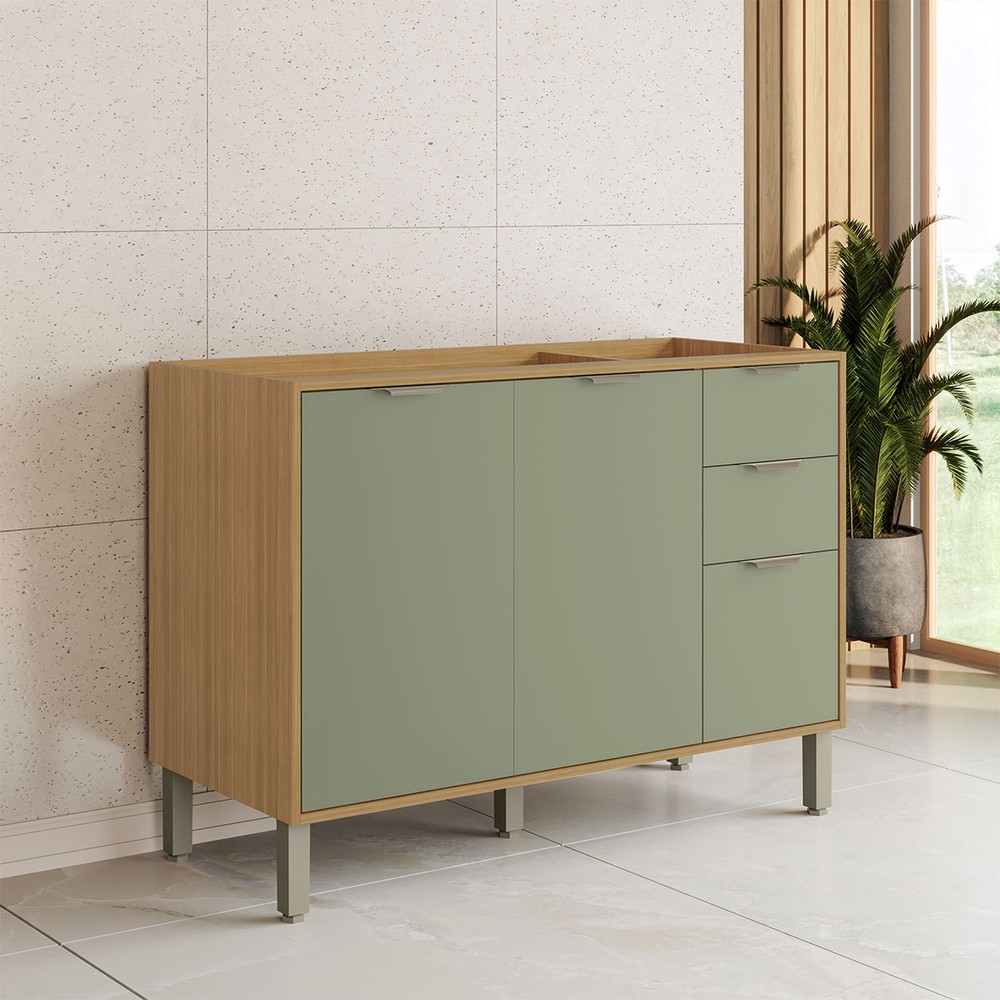 O(a) Balcão de Cozinha para Pia 120 Cm Colors 3 Portas 2 Gavetas 100% Mdf Freijó/Alecrim - Kits Paraná é produzido em MDF na escala de brilho Brilho, Fosca com Textura e Fosco, e possui um grau de dificuldade de montagem: Médio.